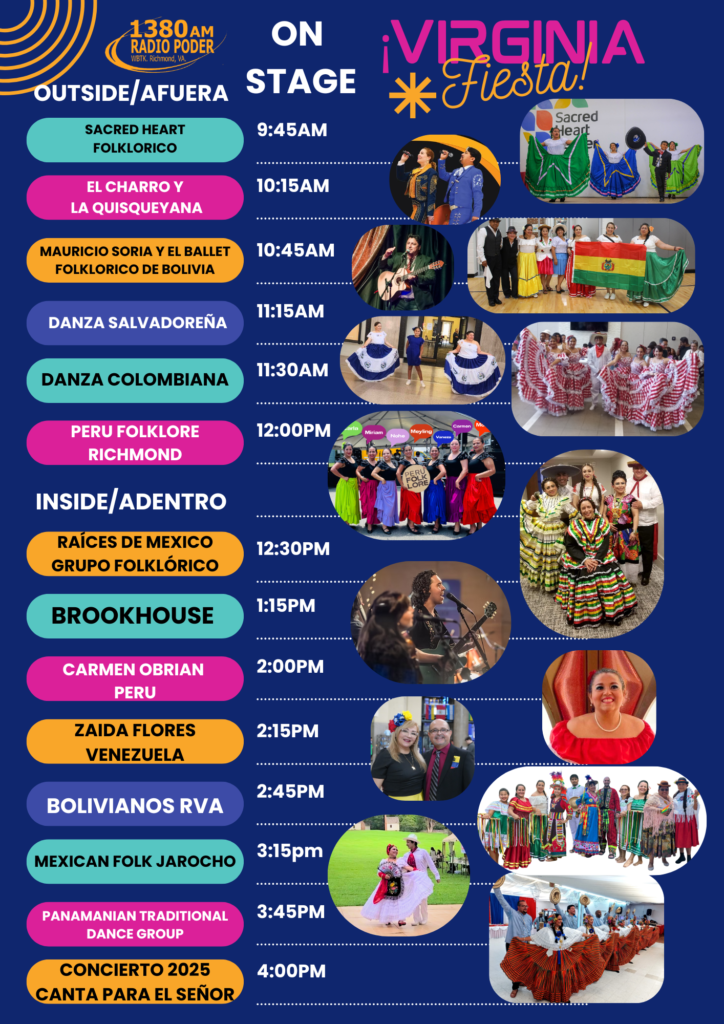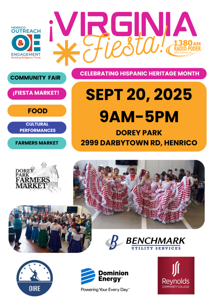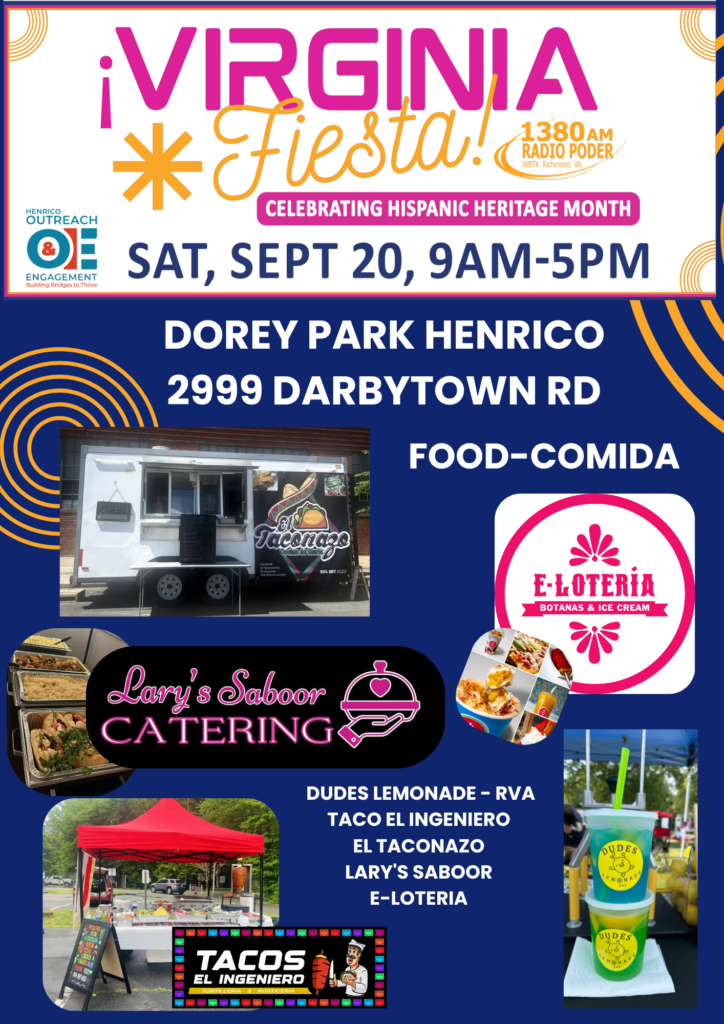 ESPAÑOL- Radio Poder 1380AM está lista para celebrar el Mes de la Herencia Hispana y ¡Estás invitado a unirte a la Fiesta! Por cuarto año, ¡Virginia Fiesta! Será una celebración de las culturas Latinas/Hispanas en Virginia. ¡El día incluirá una feria comunitaria, vendedores, camiones de comida, presentaciones culturales, actividades para niños, DOREY PARK FARMERS MARKET y más! Los detalles sobre la programación del día estarán disponibles a medida que se acerque la fecha del evento. Para espacio de mesa o para convertirse en patrocinador contacta a [email protected]